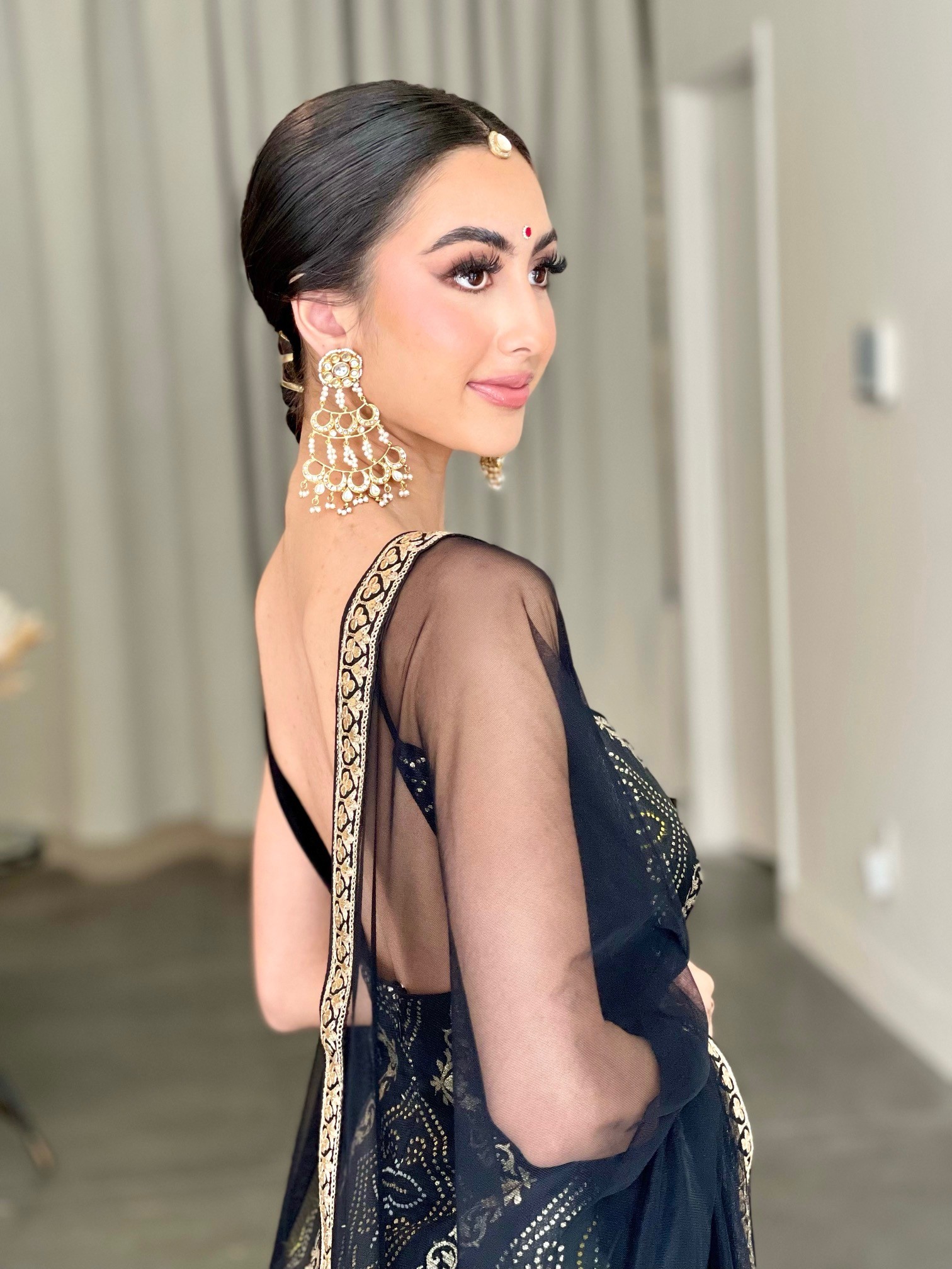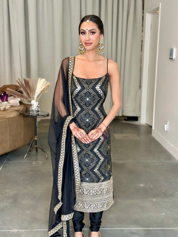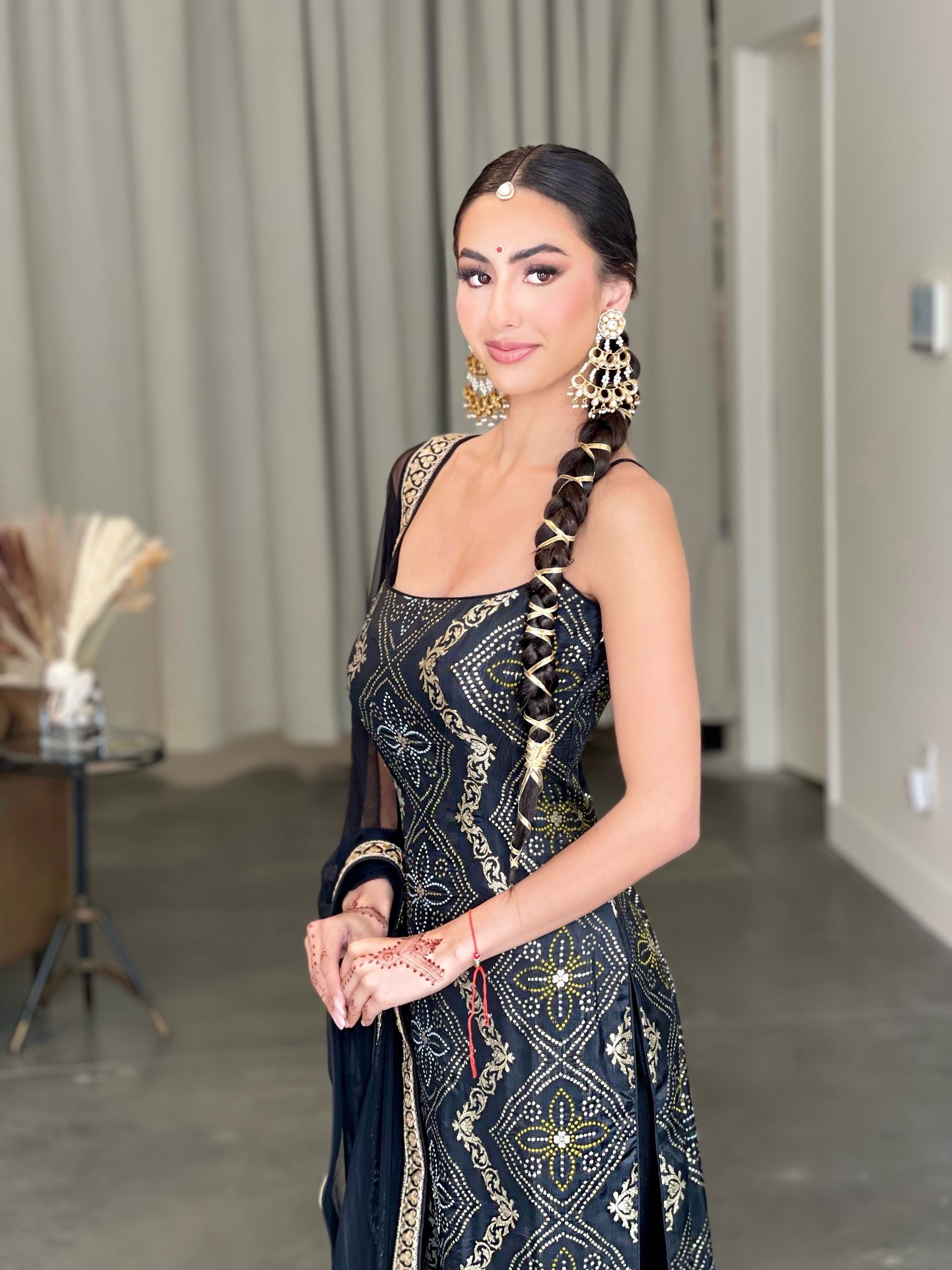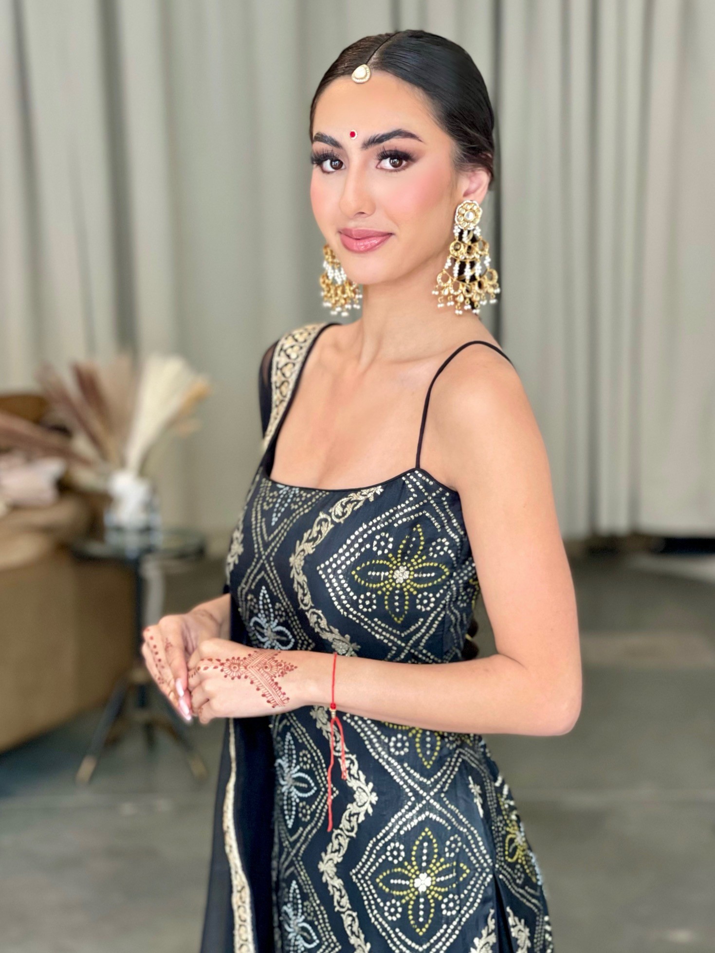 Kameez • Black dupian like fabric with gold zari and bandini print.