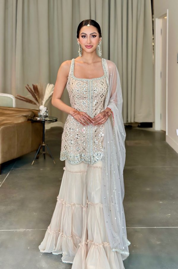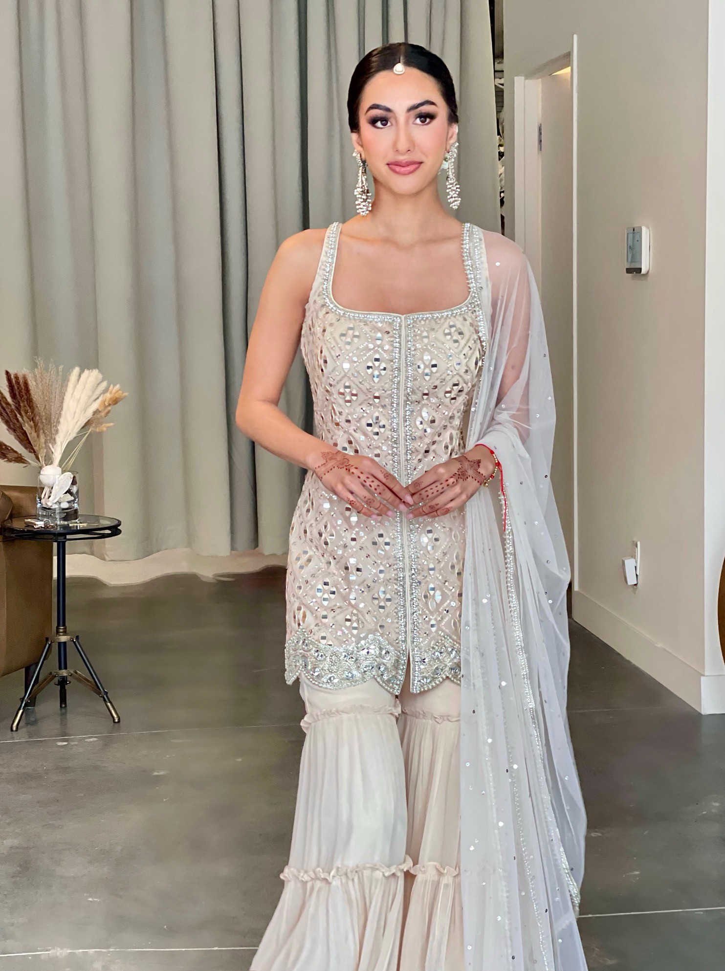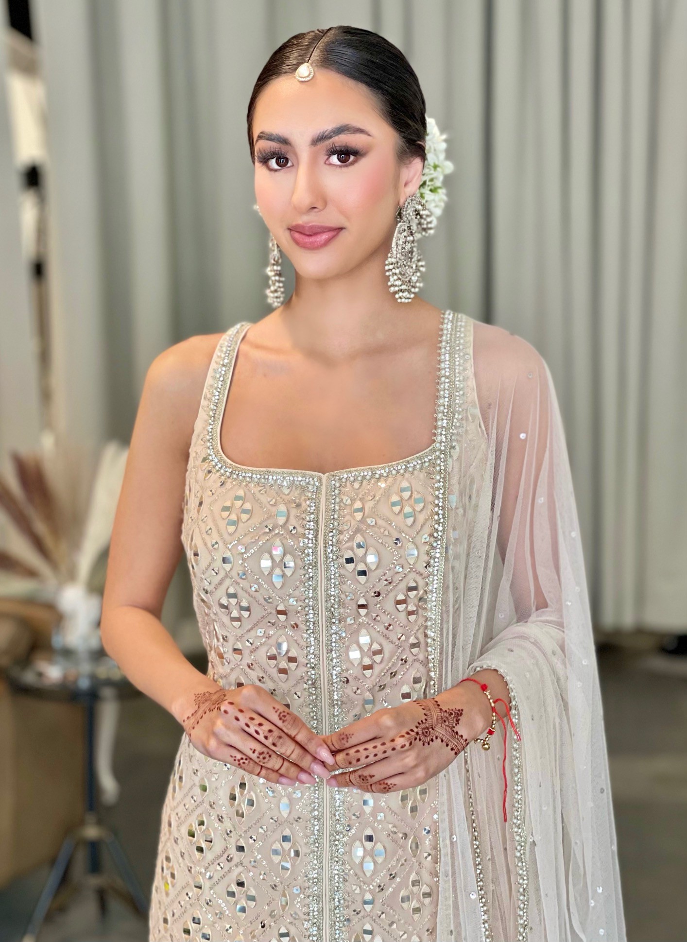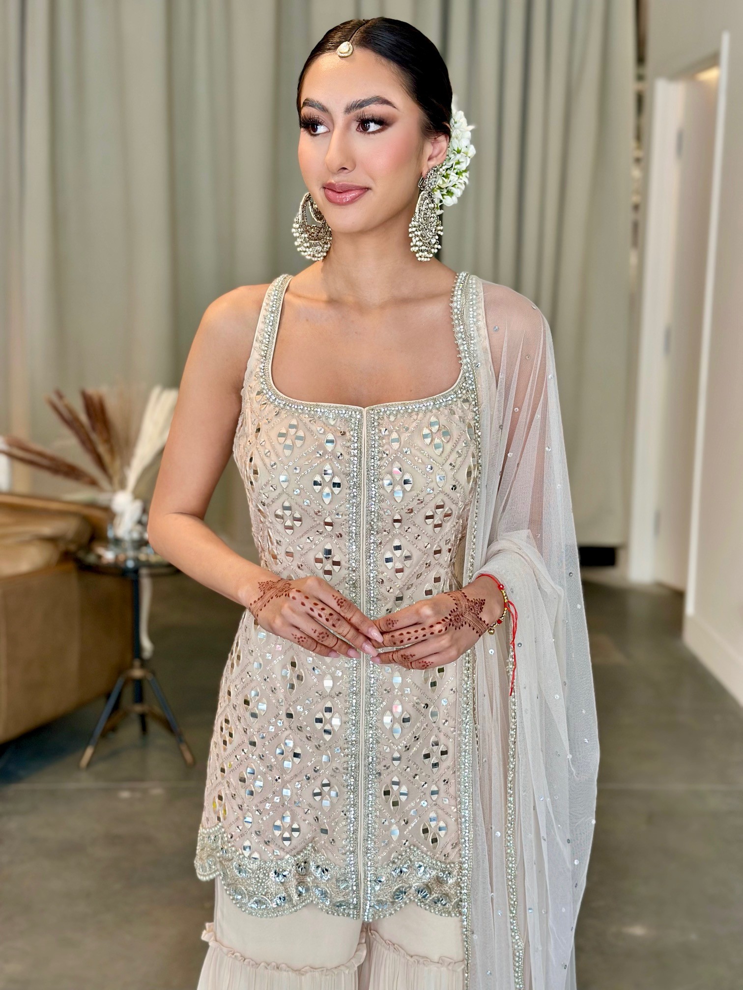 Kameez • Heavy abla, sequins and thread work on blush georgette, finished with stone and pearl borders.